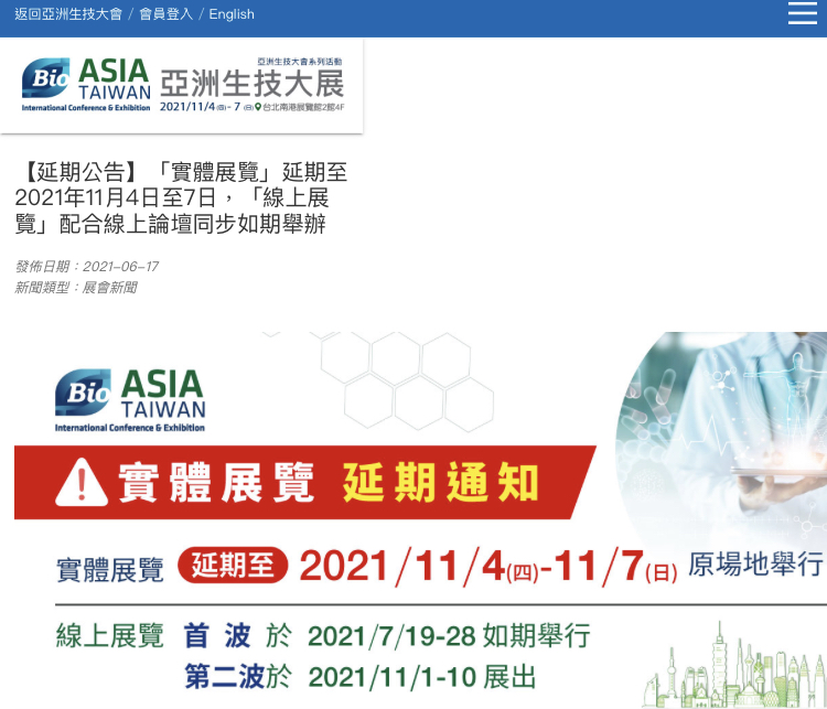 图说:「2021亚洲生技大展原定展出日期因应疫情改成线上展览。 |