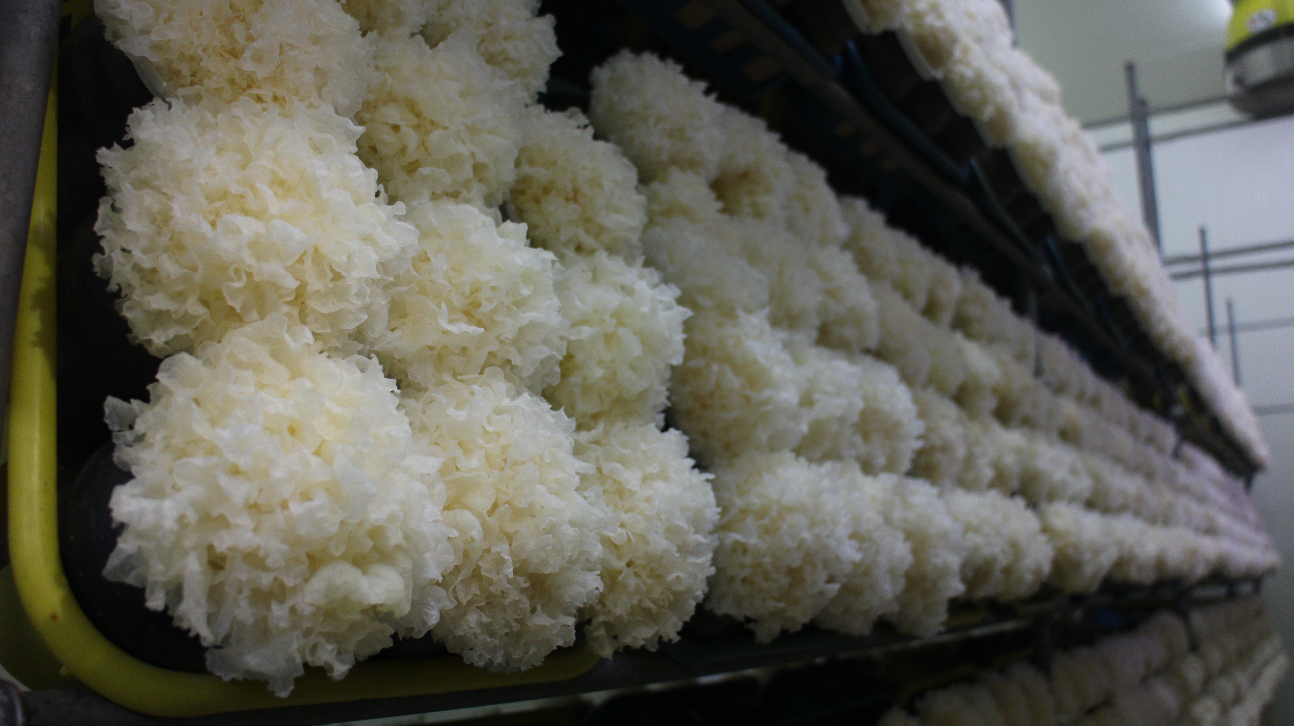 图说:「黄圣雄的万生生技农场以正压环控设施栽培银耳,菇型饱满宛如白色牡丹,并散发浓郁桂花香。 |