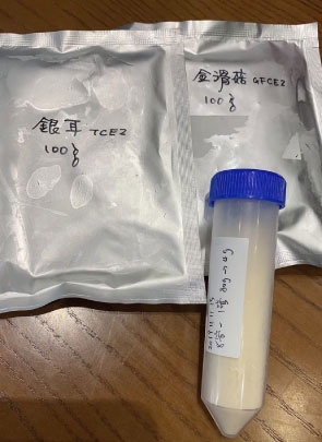 李主任表示,金滑菇材料是博士班研究生黄圣雄所开发的新兴菇种,与银耳均栽培在其经营之万生生技农场的智慧环控菇场内。根据行政院农委会报告,银耳所含的透明胶质主要为多醣体,属酸性异质多醣体(acidic heteropolysaccharide),有别于黑木耳及其他菇类的β-(1,3) D-葡聚糖(glucan)之同质多醣体(homopolysaccharide)。